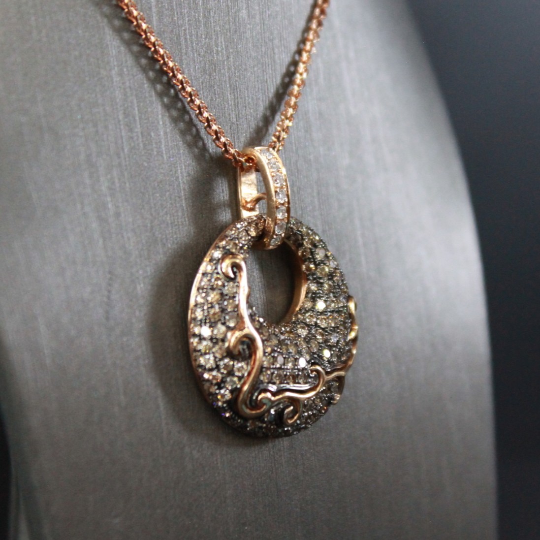 Champagne & White Diamond Circle Swirl Pendant – Black Rhodium – 18K Rose Gold (Chain Not Included)