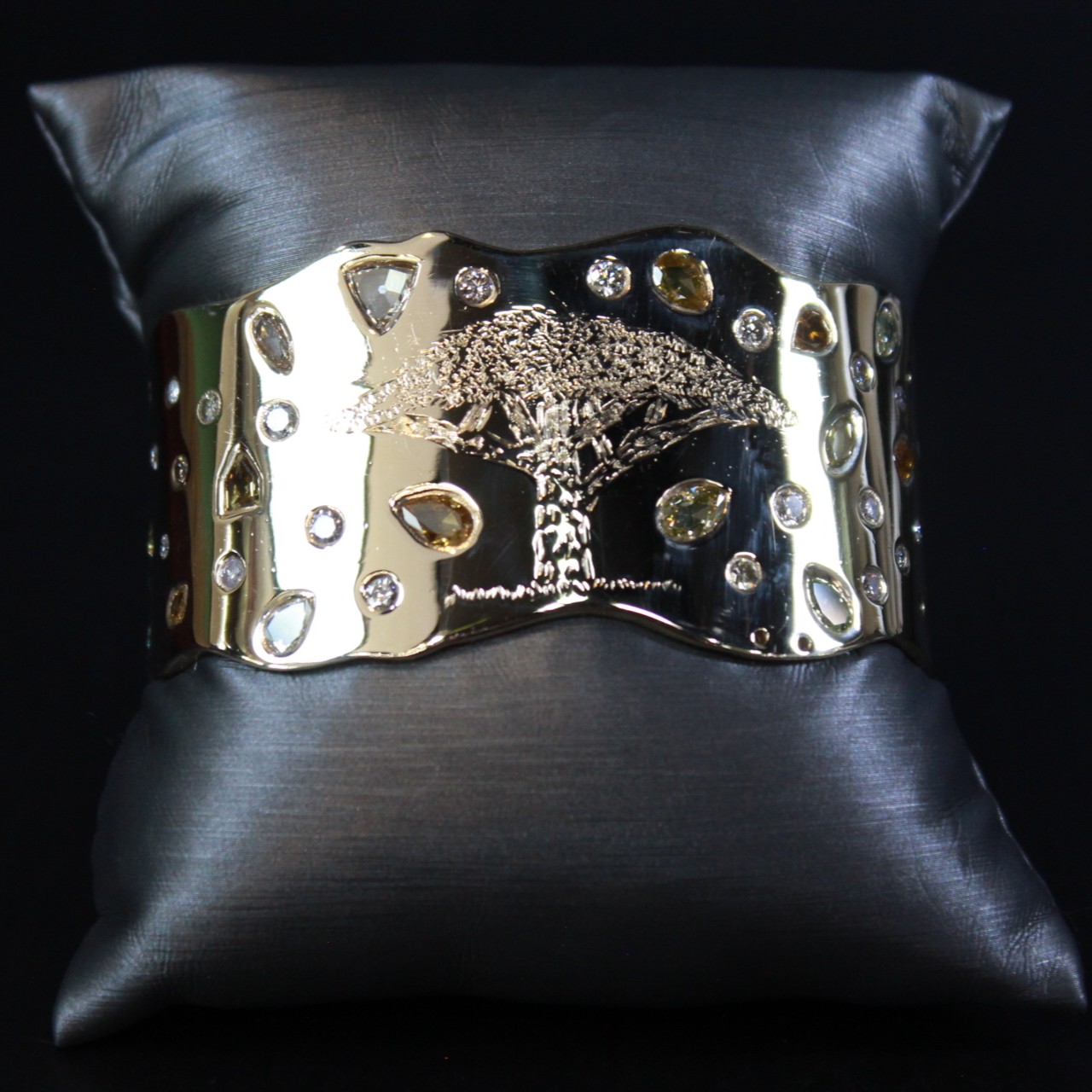 Multi Fancy Colored Diamond ‘Tree of Life’ Bangle Bracelet – 14K Yellow Gold