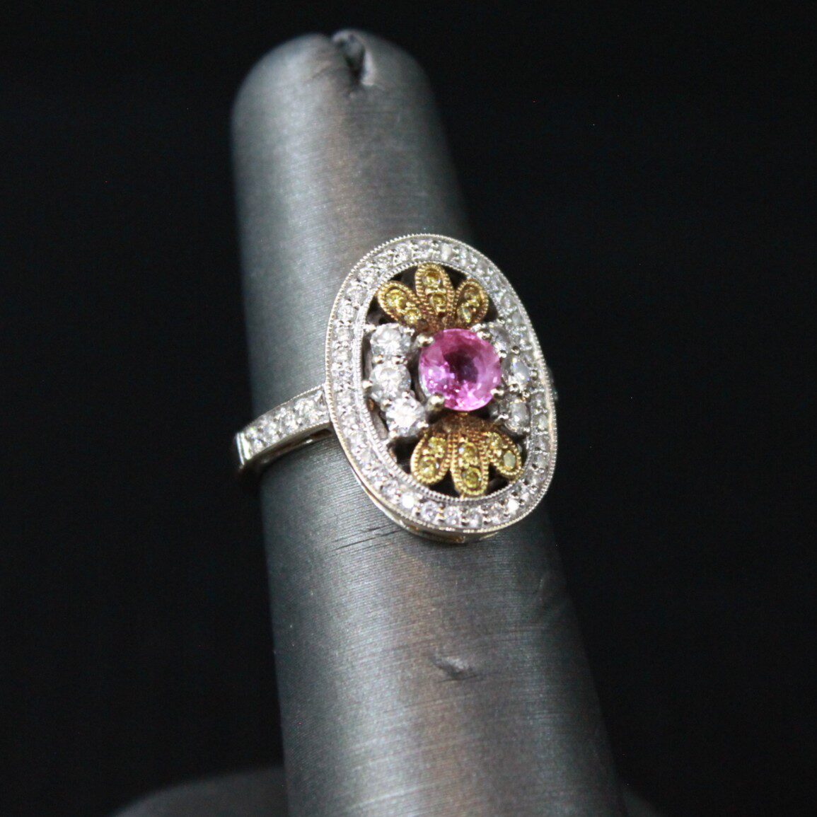 Pink Sapphire & Diamond Filigree Ring 0.51 ct Pink Sapphire · 0.63 ctw Yellow & White Diamonds · 18K White Gold