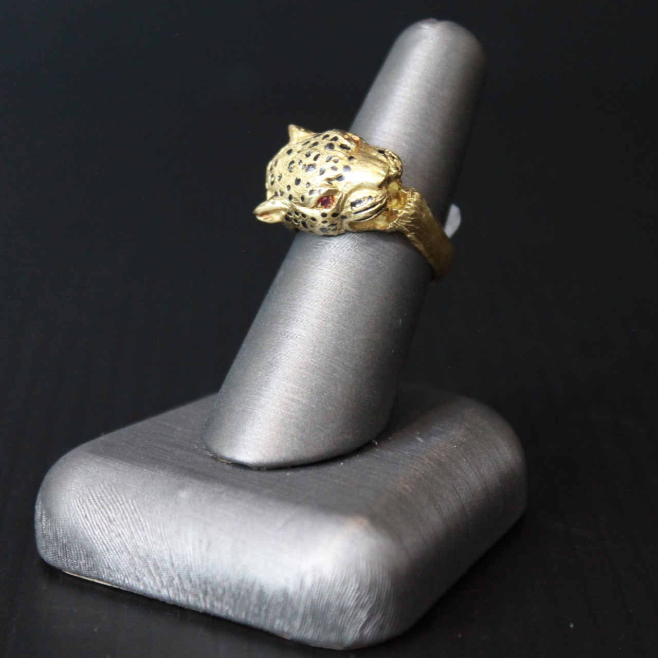 Enamel Leopard Head Ring with Ruby Eyes French 18K Yellow Gold