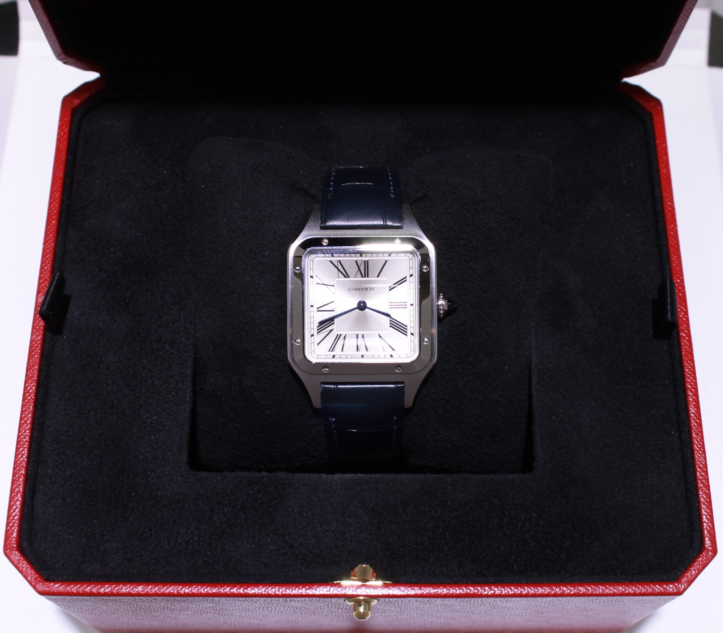 Cartier Santos-Dumont – Stainless Steel – Silver Satin Roman Dial – Dark Navy Blue Alligator Strap with Tang Bucklel
