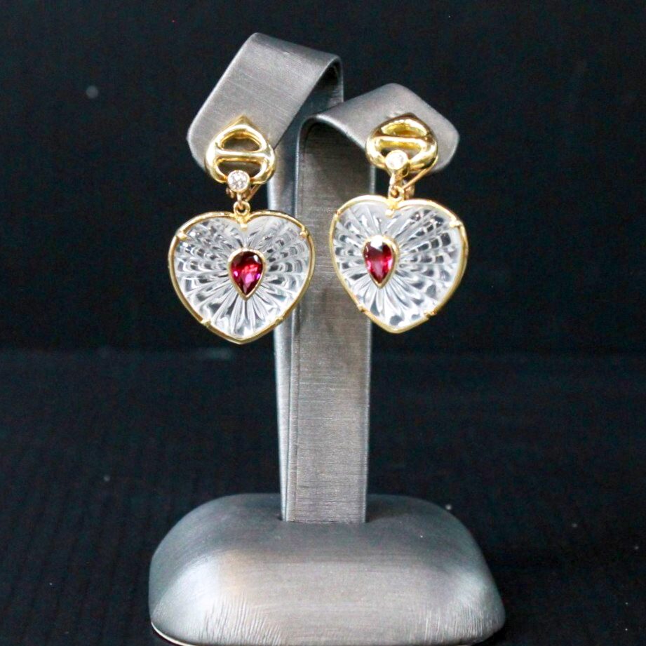 Diamond, Rubellite & Carved Quartz Heart Dangle Earrings – 18K Yellow Gold